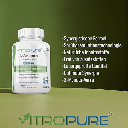 - Hochdosiertes L-Arginin (mindestens 1000 mg pro Tagesdosis) für eine effektive Unterstützung der Gefäßgesundheit und Vitalität