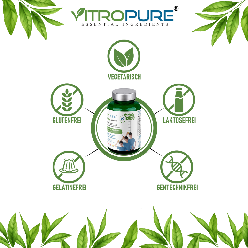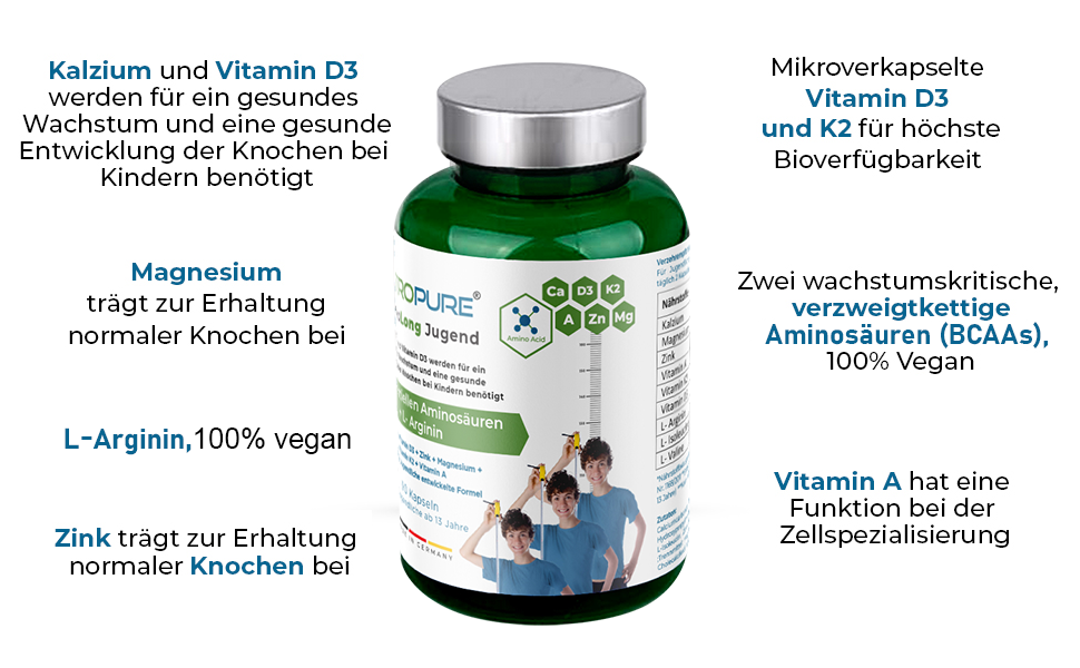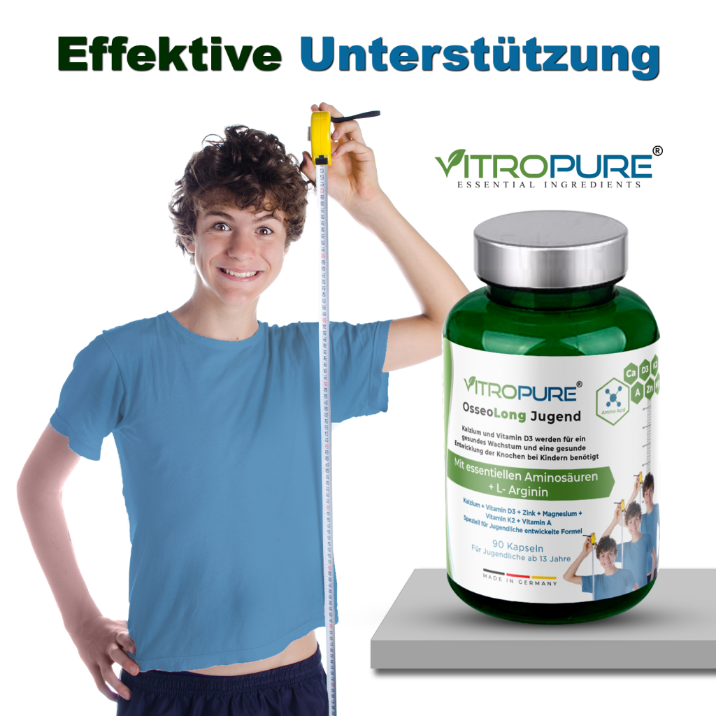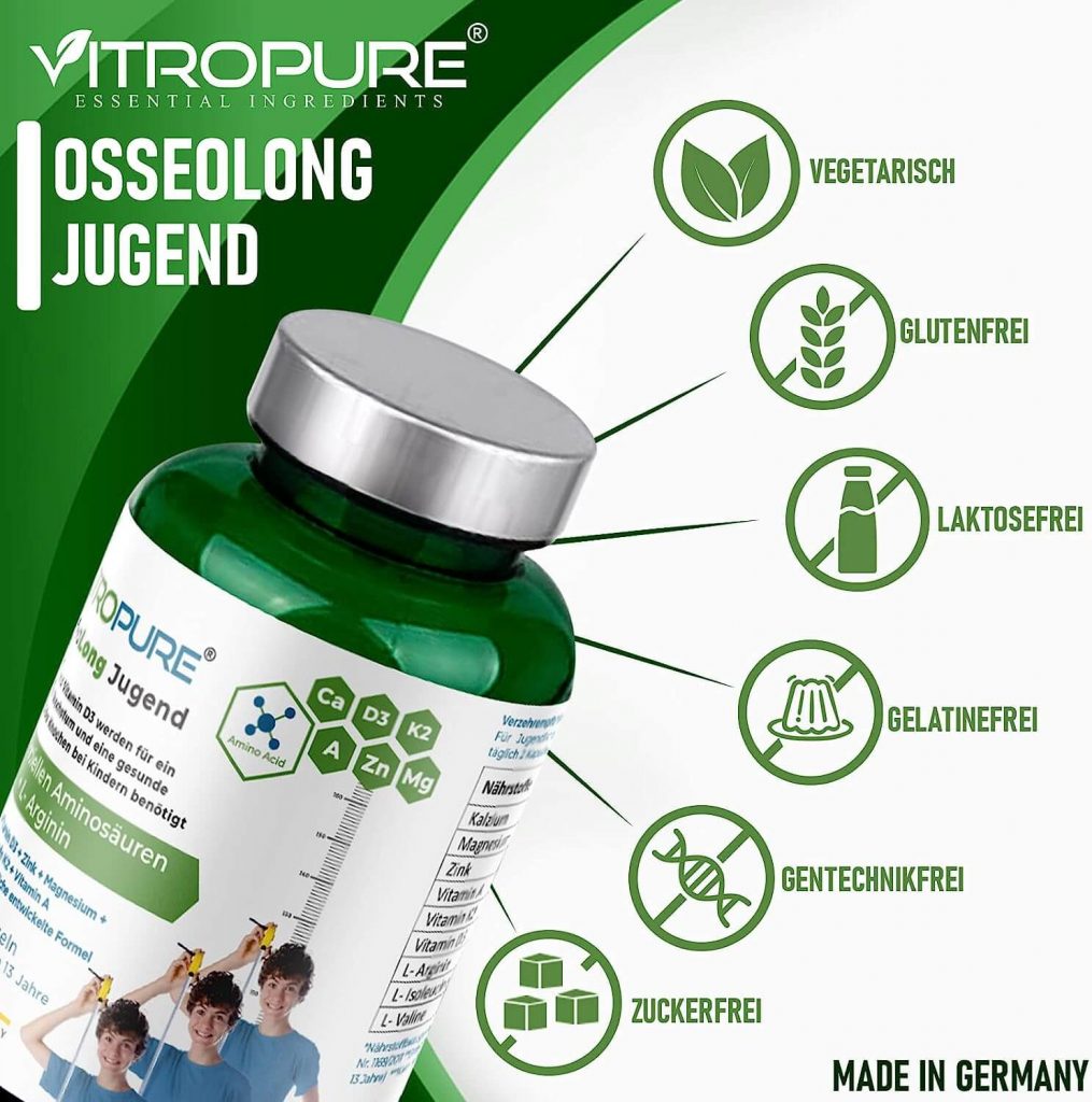OsseoLong Jugend ist eine speziell für Jugendliche entwickelte synergistische (zusammenwirkende) Kombination mit zwei wachstumskritischen verzweigtkettigen Aminosäuren (BCAAs) und die Aminosäure L-Arginine zur Unterstützung der Knochenentwicklung. Vitamin D3 und Vitamin K2 gewährleisten die höchste Stabilität, Reinheit und ein starkes biologisches Potenzial, sowie auch mit Kalzium, Zink, Magnesium, Vitamin A und weiteren essentiellen Nährstoffen zur effektiven Unterstützung. Die zwei wachstumskritischen verzweigtkettigen Aminosäuren (BCAAs) und die L-Arginine werden aus Fermentation gewonnen und sind 100% vegan. Die kapseln enthalten keine tierischen Produkte. Sie werden hauptsächlich aus hochwertigen vegetarischen Zutaten hergestellt. Frei von Gluten, Laktose, Gentechnik und Allergen. Das Produkt ist laborgeprüft. Zertifizierungsstelle: AGROLAB LUFA GmbH, Datum der Zertifizierung: 13.09.2022